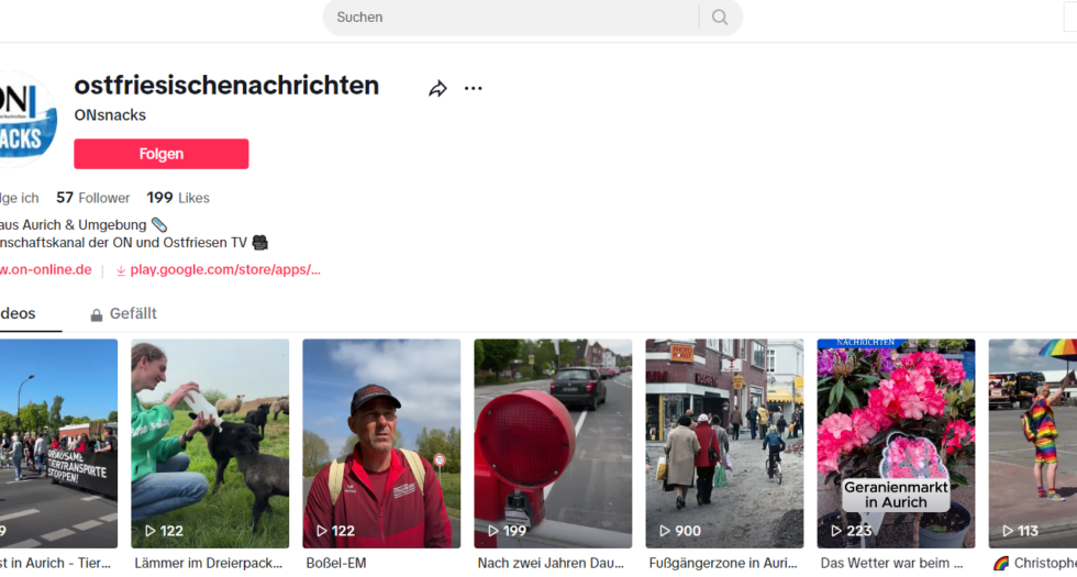 Die Ostfriesischen Nachrichten (ON) sind jetzt auch bei TikTok. Unter dem Kanalnamen „ONsnacks“ haben wir am 18. April unser erstes Video veröffentlicht. Mit dem Format wollen wir deutlich jüngere Leute erreichen. Bisher zeigt sich: Das klappt! 70 Prozent der User sind zwischen 18 und 35 Jahre jung. Wir erwarten künftig noch ein kräftiges Wachstum in dem Kanal.